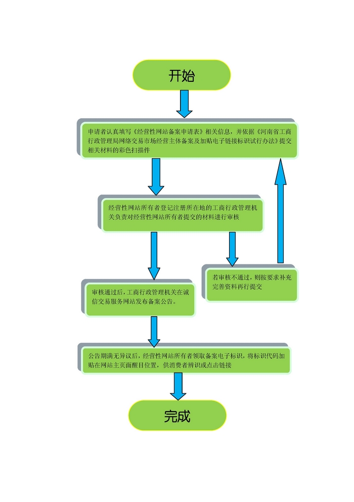 一、電子標(biāo)識申請的基本流程 (一)經(jīng)營性網(wǎng)站所有者通過訪問河南省工商行政管理局網(wǎng)絡(luò)誠信交易服務(wù)網(wǎng)站(http://wj.haaic.gov.cn),在線填寫《經(jīng)營性網(wǎng)站備案申請表》相關(guān)信息,并依據(jù)《河南省工商行政管理局經(jīng)營性網(wǎng)站備案及加貼電子鏈接標(biāo)識試行辦法》提交相關(guān)材料的彩色掃描件(規(guī)格:圖片格式為jpg或bmp、色彩位數(shù)8-16位、掃描分辨率150-200 dpi。); (二)經(jīng)營性網(wǎng)站所有者注冊登記地的省轄市或省直管試點(diǎn)縣(市)工商局負(fù)責(zé)對經(jīng)營性網(wǎng)站所有者提交的材料進(jìn)行審核。審核通過后,工商行政管理機(jī)關(guān)在誠信交易服務(wù)網(wǎng)站發(fā)布備案公告。在公告期滿且無異議后向該備案申請人發(fā)放經(jīng)營性網(wǎng)站備案號和備案電子鏈接標(biāo)識,建立相關(guān)鏈接頁面。 (三)經(jīng)營性網(wǎng)站所有者按約定方法(數(shù)字證書密鑰或約定密碼)領(lǐng)取備案電子標(biāo)識,會同網(wǎng)站設(shè)計(jì)單位將標(biāo)識代碼加貼在網(wǎng)站主頁面醒目位置,供消費(fèi)者辨識或點(diǎn)擊鏈接。 二、申請流程示意圖